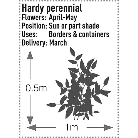 A striking hardy perennial, Brunnera macrophylla ‘Jack Frost’ produces large, heart-shaped silvery leaves with green veins. In mid to late spring these are complimented by delicate sprays of blue forget-me-not like flowers. Happiest in a shady position, Siberian Bugloss is perfect for woodland gardens or the front of shady borders where it will slowly spread to form a dense, colourful ground cover. Height: 45cm (18″). Spread: 60cm (24″).