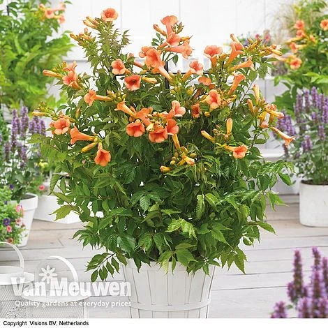 Although Campsis are fully hardy, they will perform better when grown against a warm, sunny wall for added protection and better flowering performance. Plant into moist, but well-drained soil in a sunny position. Alternatively, grow Campsis plants in patio containers using soil based compost such as John Innes No.2, and add extra grit for drainage.